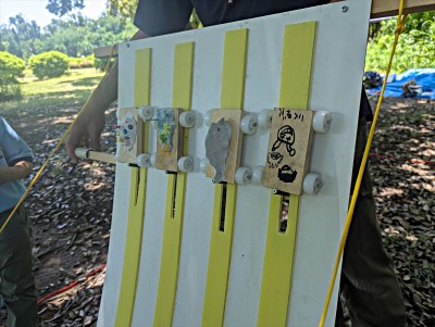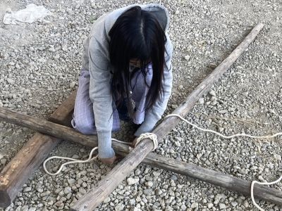 | 後輩たちと蒲鉾カーを創って競い合いました 体験の子たちに優しく接して、結索でブランコなども創りました |