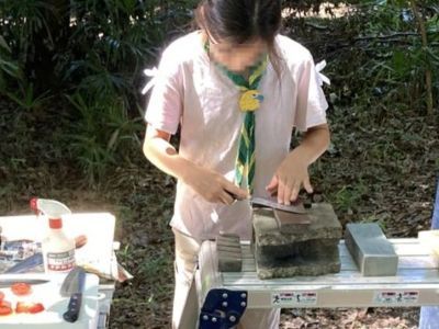 市内とは思えない心地よい風が吹き抜ける森でキャンプ 朽木で立ち竈を創り、研ぎを学び、イサキを捌いて、御褒美に本職の握りも頂きました オープンデーではカブを迎えてボーイの野営生活を眺めてもらいました |